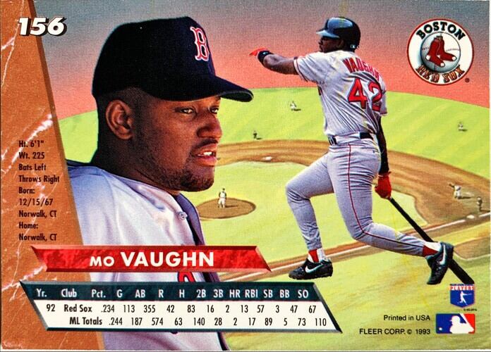 MLBのカードが大量入荷してきました! MLBカード 93FLEER Mo Vaughn #156 RED SOXです。 ぜひあなたのコレクションに加えてください! 特にキズなどありませんが、中古品ですので、状態は写真にてご確認ください。 50枚以上購入ご希望の方は別途ご連絡ください。お値段ディスカウントいたします。