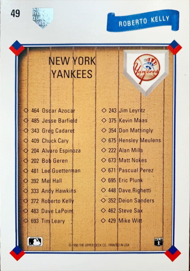 MLBのカードが大量入荷してきました! MLBカード 91UPPERDECK Roberto Kelly #049 YANKEES LISTです。 ぜひあなたのコレクションに加えてください! 特にキズなどありませんが、中古品ですので、状態は写真にてご確認ください。 50枚以上購入ご希望の方は別途ご連絡ください。お値段ディスカウントいたします。