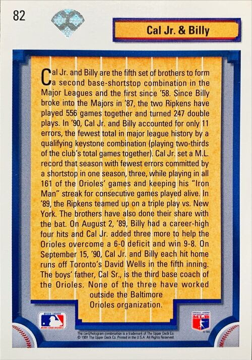 MLBのカードが大量入荷してきました! MLBカード 92UPPERDECK Cal JR & Blly #082 ORIOLESです。 ぜひあなたのコレクションに加えてください! 特にキズなどありませんが、中古品ですので、状態は写真にてご確認ください。 50枚以上購入ご希望の方は別途ご連絡ください。お値段ディスカウントいたします。