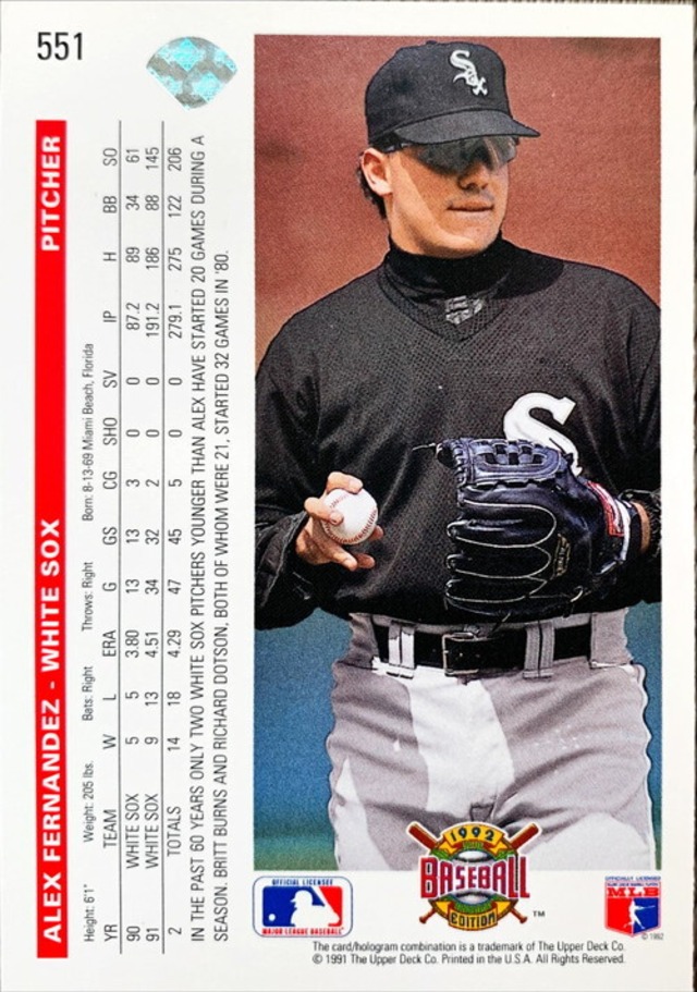 MLBのカードが大量入荷してきました! MLBカード 92UPPERDECK Alex Fernandez #551 WHITE SOXです。 ぜひあなたのコレクションに加えてください! 特にキズなどありませんが、中古品ですので、状態は写真にてご確認ください。 50枚以上購入ご希望の方は別途ご連絡ください。お値段ディスカウントいたします。