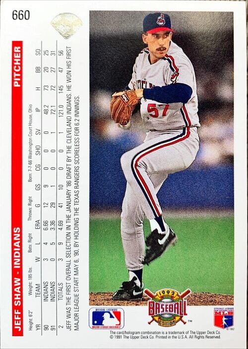 MLBのカードが大量入荷してきました! MLBカード 92UPPERDECK Jeff Shaw #660 INDIANSです。 ぜひあなたのコレクションに加えてください! 特にキズなどありませんが、中古品ですので、状態は写真にてご確認ください。 50枚以上購入ご希望の方は別途ご連絡ください。お値段ディスカウントいたします。