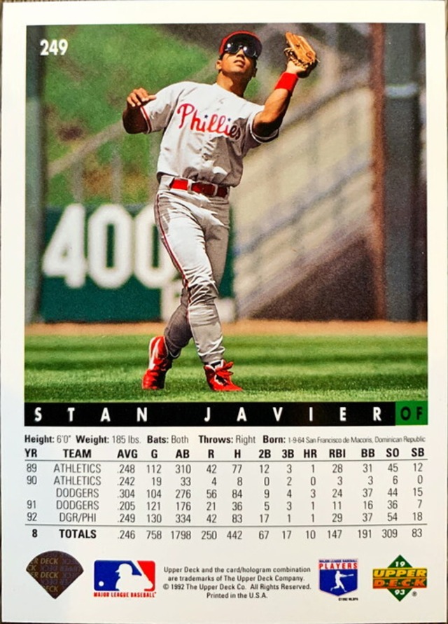 MLBのカードが大量入荷してきました! MLBカード 93UPPERDECK Stan Javier #249 PHILLIESです。 ぜひあなたのコレクションに加えてください! 特にキズなどありませんが、中古品ですので、状態は写真にてご確認ください。 50枚以上購入ご希望の方は別途ご連絡ください。お値段ディスカウントいたします。