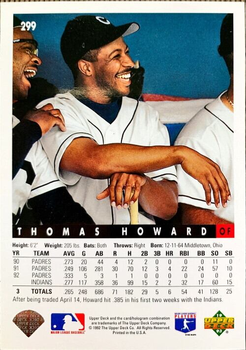 MLBのカードが大量入荷してきました! MLBカード 93UPPERDECK Thomas Howard #299 INDIANSです。 ぜひあなたのコレクションに加えてください! 特にキズなどありませんが、中古品ですので、状態は写真にてご確認ください。 50枚以上購入ご希望の方は別途ご連絡ください。お値段ディスカウントいたします。